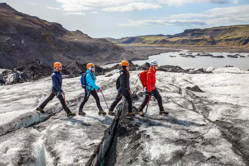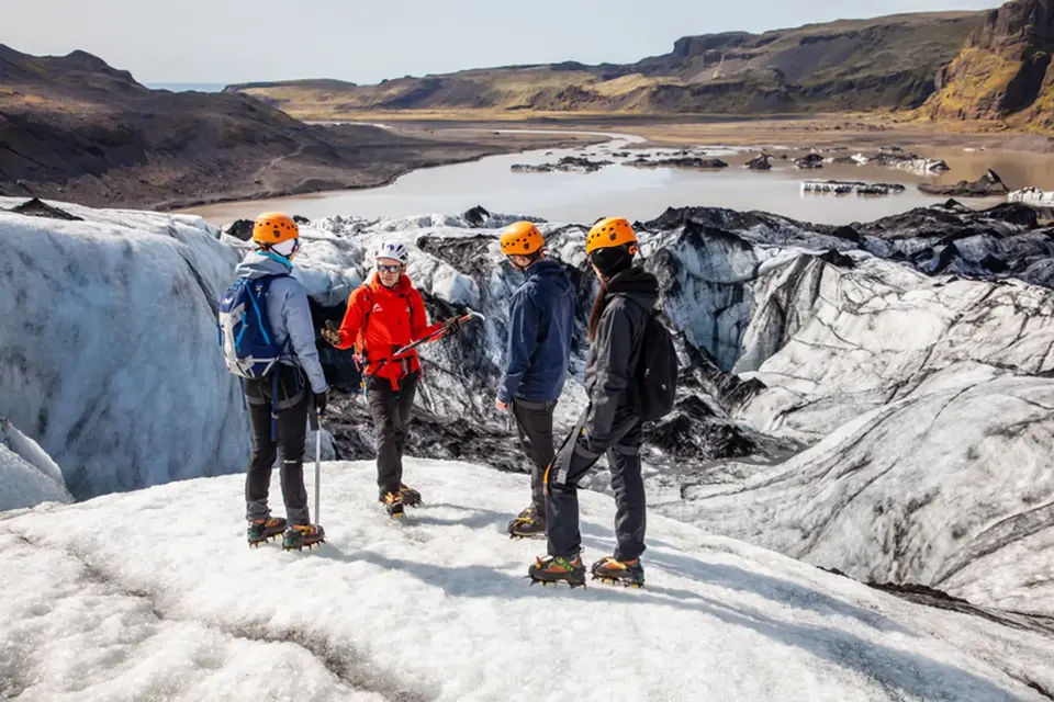On this fun, safe, and easy to moderate glacier hiking tour, you can explore the wonderland of ice sculptures, water cauldrons, ridges, and deep crevasses on the breathtaking Sólheimajökull glacier. While enjoying all the features of the glacier and its spectacular surroundings, you will learn more about the behavior of glaciers and their impact on nature.